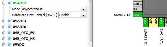 Dodatkowo w celu debugu oraz do przesyłania informacji o sygnale należało by uruchomić jeden z układów USART. Do tego celu wybrałem USART2 w trybie asynchonicznym. Domyślnie sygnał TX umieszczony jest na pinie PA2, RX natomiast na pinie PA3.
